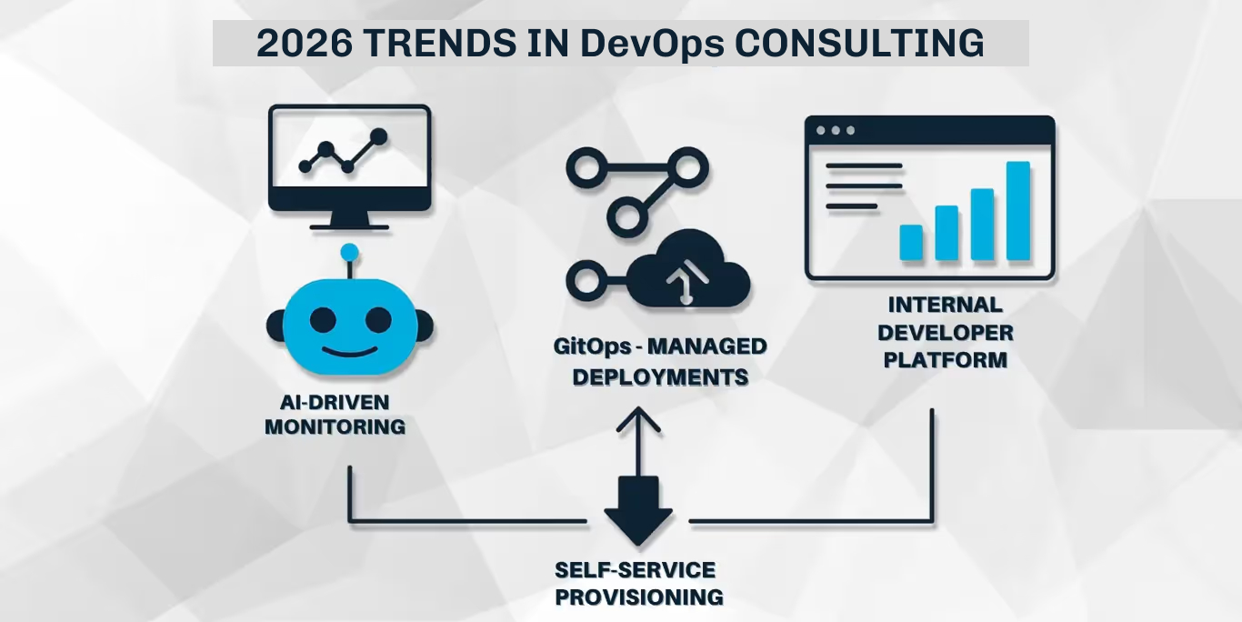 In 2026, dominant trends in DevOps consulting include AI-driven monitoring, GitOps-managed deployments, internal developer platforms, and self-service provisioning with embedded governance.