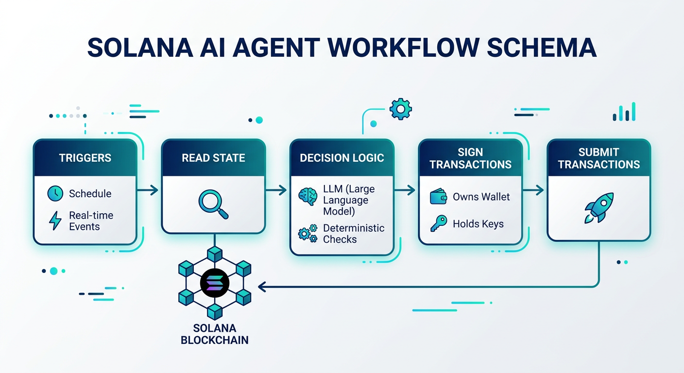 On-chain, the loop looks like this. The agent reads state, runs decision logic (often an LLM plus deterministic checks), signs transactions, and submits them. It owns a wallet, holds keys, and triggers off a schedule or off real-time events.