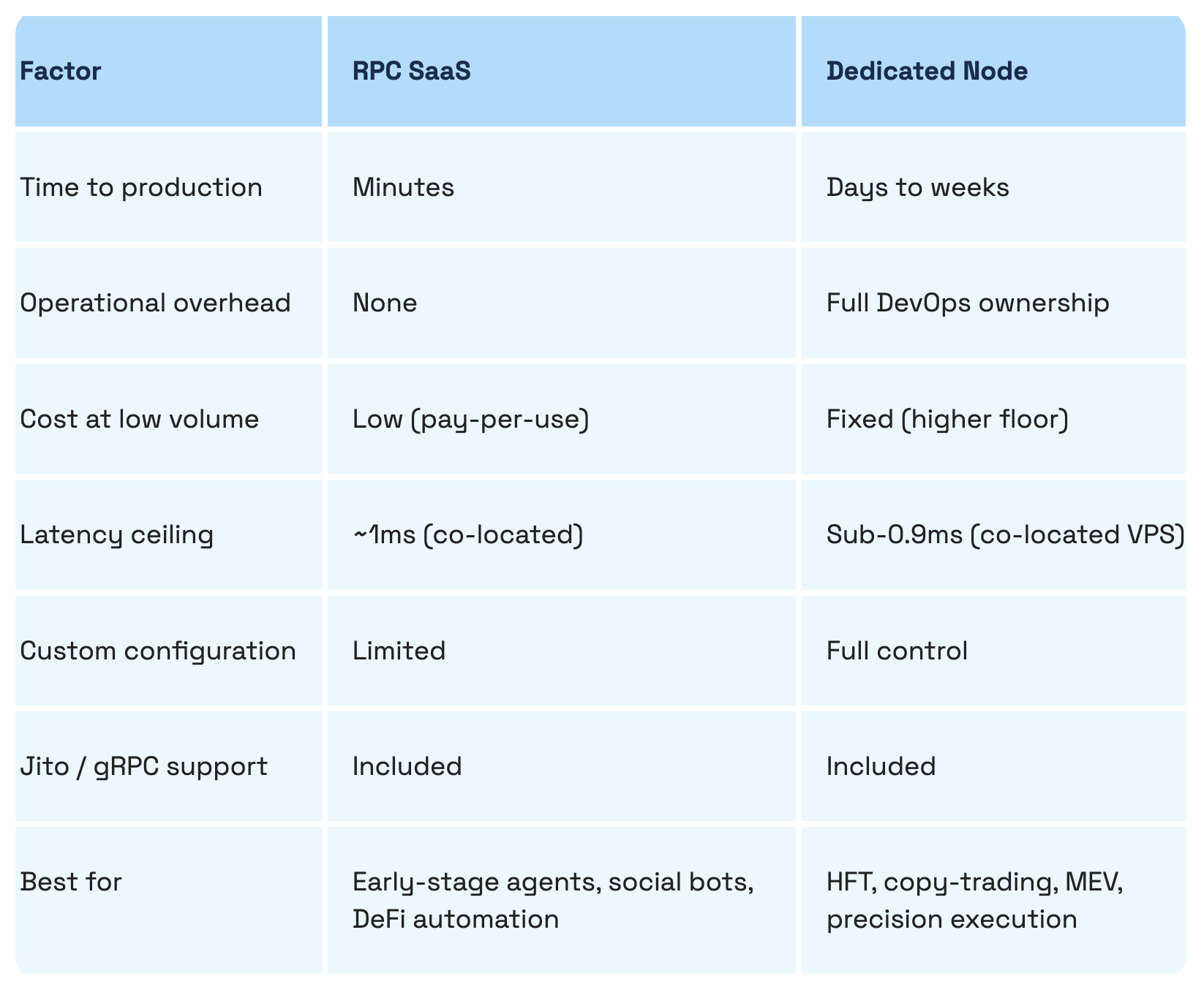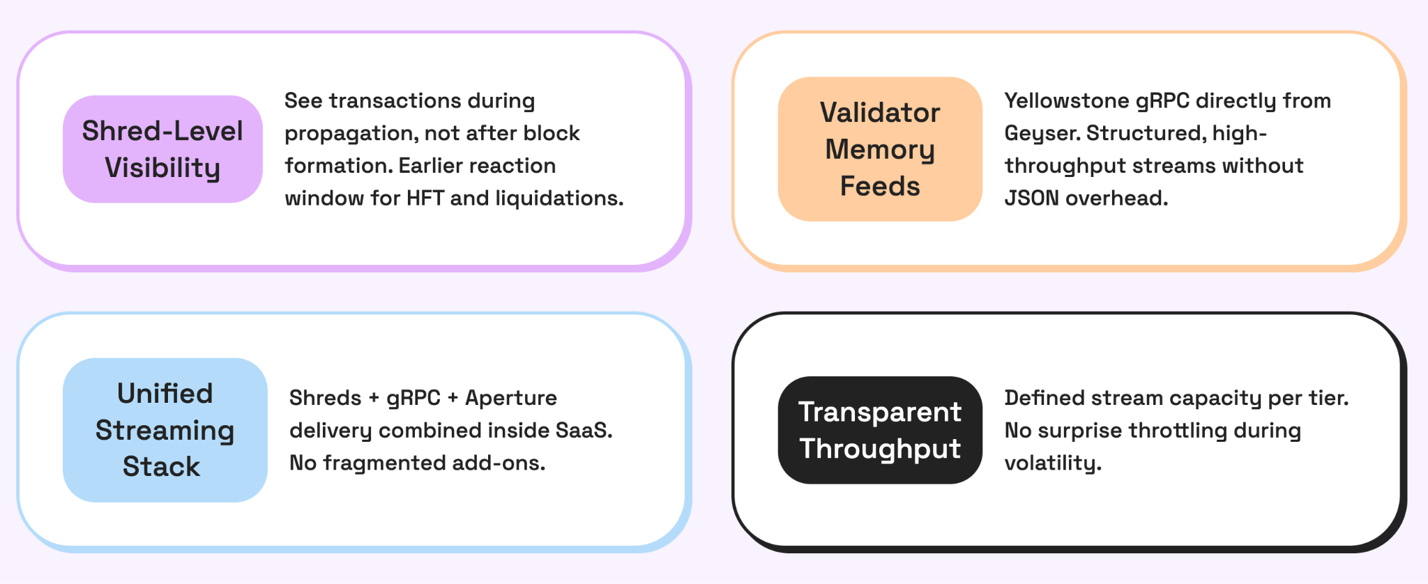 For teams developing precision execution systems, the dedicated node path offers a complete stack: co-location in Frankfurt or US East, Jito ShredStream, Yellowstone gRPC, and direct access to the node's JSON-RPC, all without shared infrastructure with the validator network.