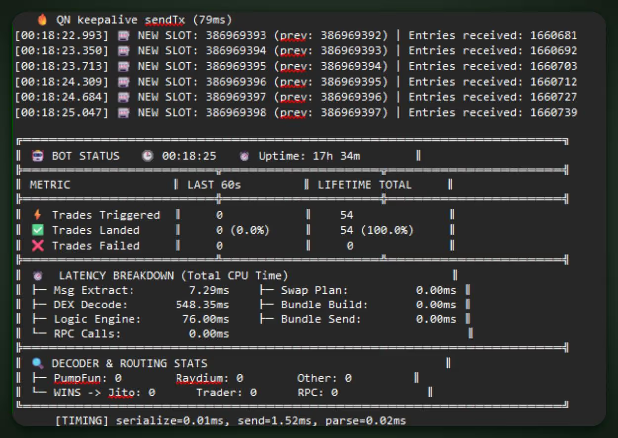 A concrete run: a Rust copy-trading agent, co-located with a Frankfurt node, hit 15 ms best-case landing and kept same-slot or +1 slot execution against KOL wallets. In a 100,000-call stress test, the node stayed under 1 ms response time with no rate limiting. That’s what stable infra looks like when the tape speeds up.