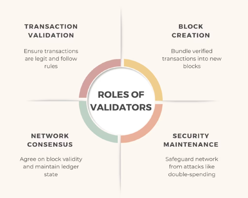 Each validator helps determine which transactions are valid, when a block is produced, and how the chain reaches agreement.